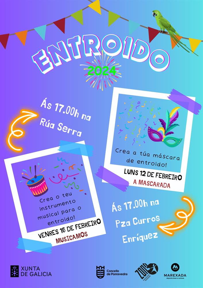 O LUNS 12 DE FREBREIRO CREA A TÚA MÁSCARA DE ENTROIDO NA PRAZA DE CURROS ENRÍQUEZ E O VENRES 16 DE FEBREIRO CREA O TEU INSTRUMENTO MUSICAL NA RÚA SERRA.
