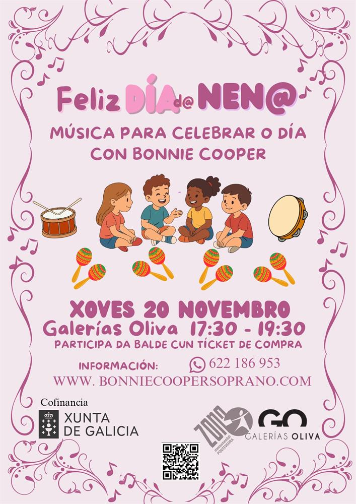 O próximo xoves 20 de novembro, Galerías da Oliva converterase nun espazo de música, xogo e creatividade cunha serie de obradoiros musicais conducidos por Bonnie Cooper. A proposta inclúe catro sesións de 30 minutos, entre as 17:30 e as 19:30 horas, con dinámicas participativas, xogos sonoros, cancións e unha introdución amable e divertida á música lírica.