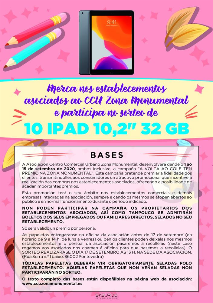 A Asociación Centro Comercial Urbano Zona Monumental (CCU Zona Monumental), con CIF: G-36.449.148, e domicilio social na Rúa Serra nº 1 baixo de Pontevedra, desenvolverá dende o 1 ao 15 de SETEMBRO do 2020, ambos inclusive, a campaña “VOLTA O COLE”. Esta campaña pretende premiar a fidelidade dos clientes, transmitíndolle aos consumidores un atractivo promocional que incentive a realización das compras nos establecementos asociados, ofrecendo a posibilidade de acadar importantes premios.